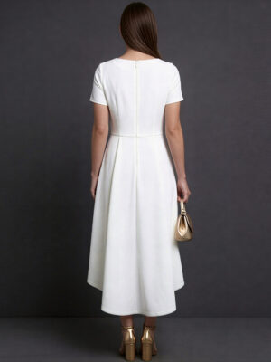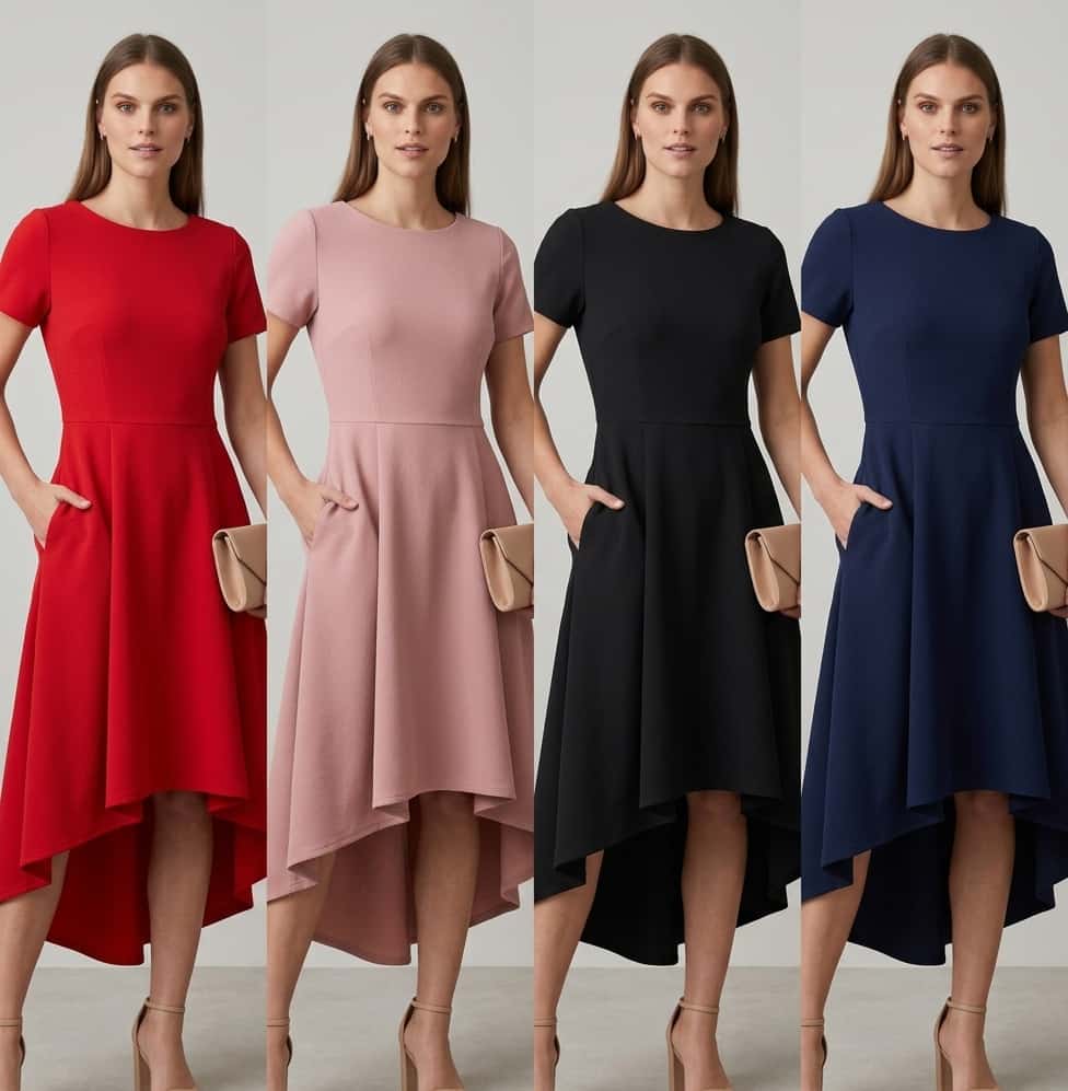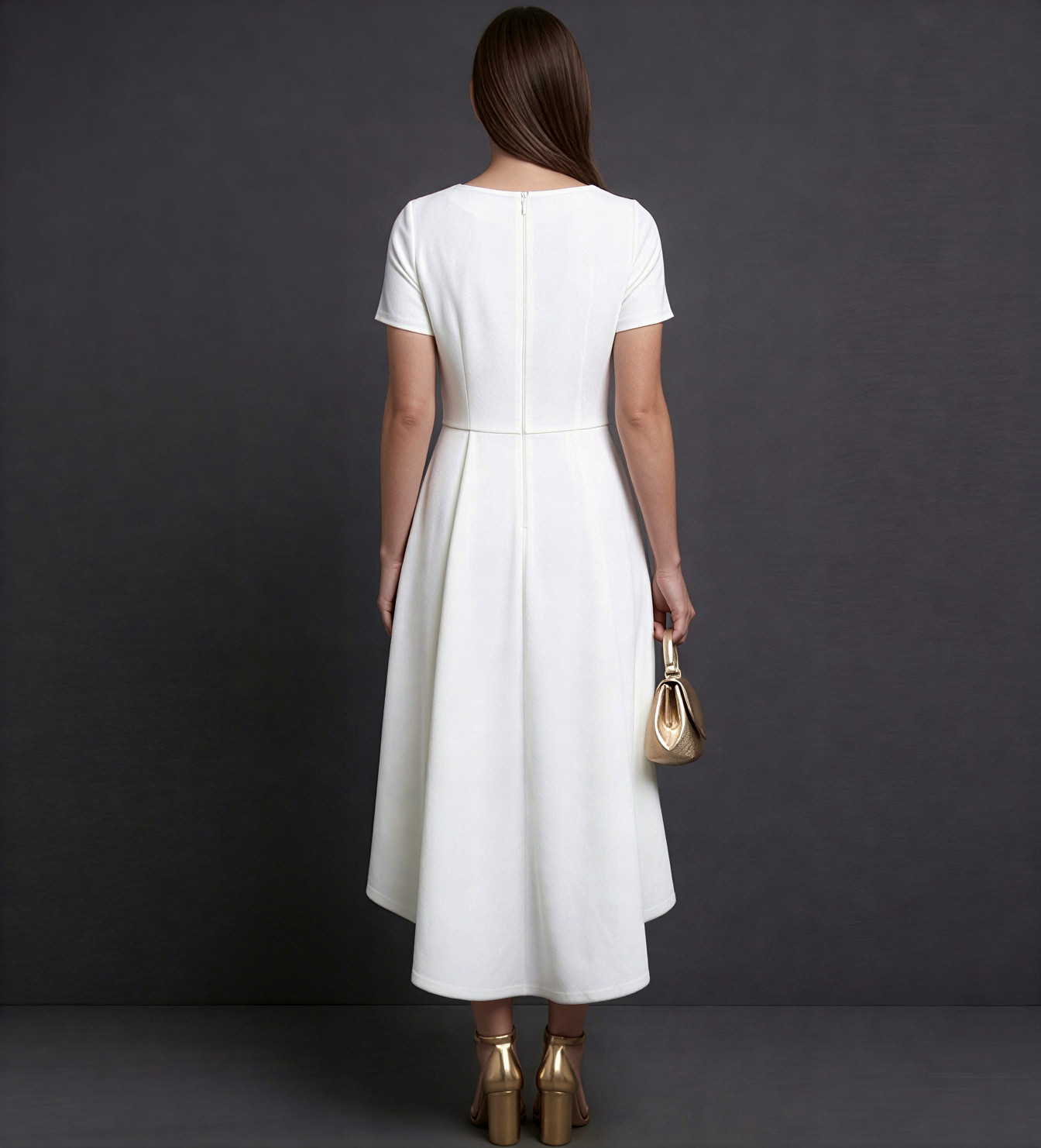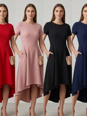 Este vestido es la combinación perfecta entre elegancia y comodidad 👗✨. Con un corte en línea A asimetrico que estiliza la silueta, escote redondo y mangas cortas, ofrece un diseño femenino y favorecedor para cualquier ocasión. Su falda con vuelo añade movimiento y sofisticación al andar. Está confeccionado en Scuba Crepé, una tela ligeramente gruesa con 40% de elasticidad que se adapta al cuerpo sin marcar, tiene una textura suave con un ligero efecto rugoso tipo crepé y un acabado mate que realza su aspecto refinado 👌. Incluye cremallera invisible en la espalda para un ajuste perfecto. ¡Ideal para eventos, oficina o salidas especiales! 💫