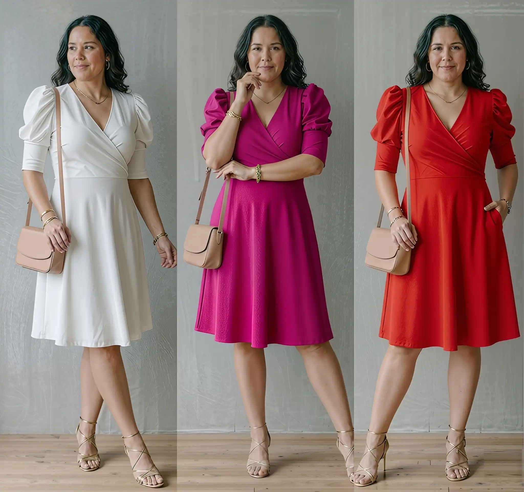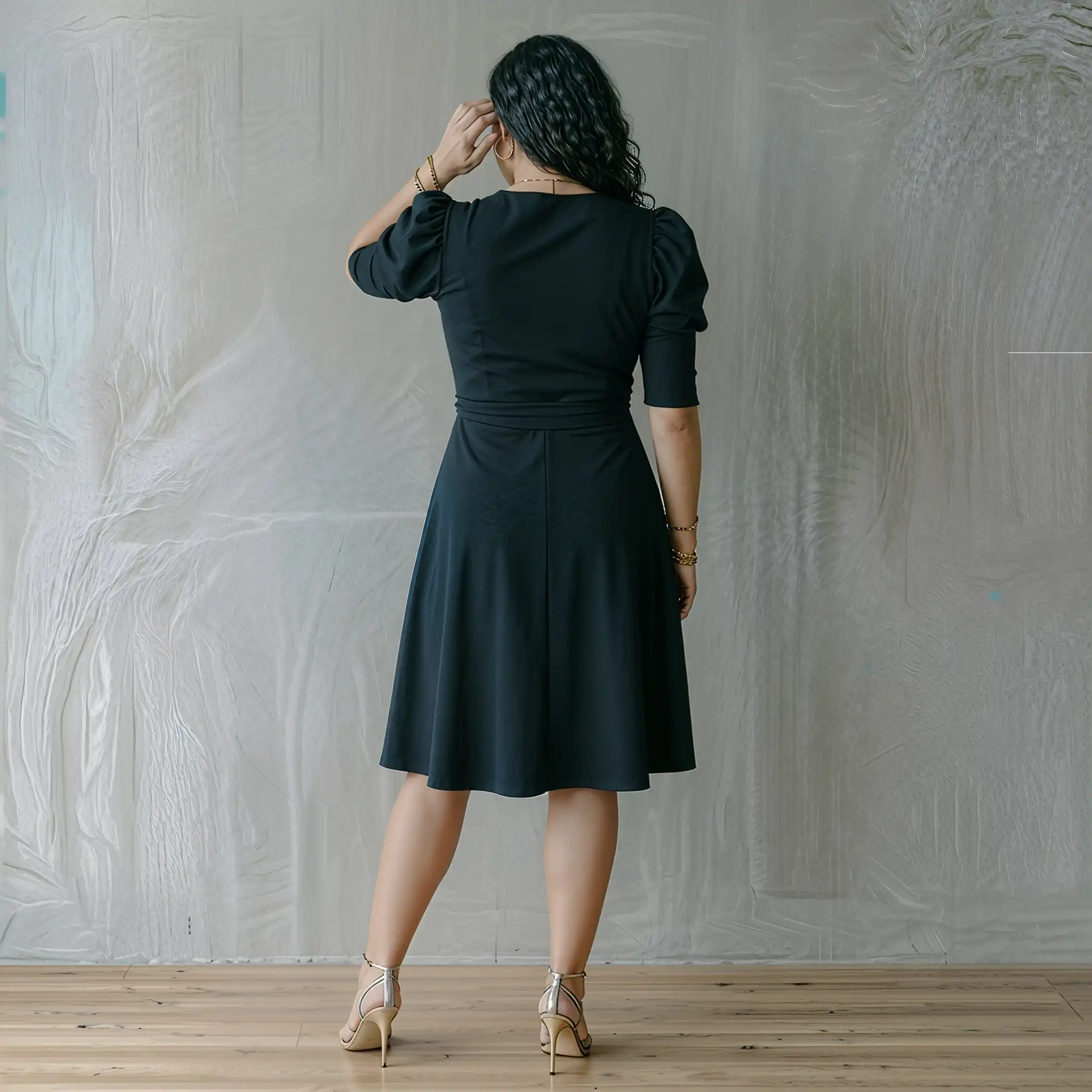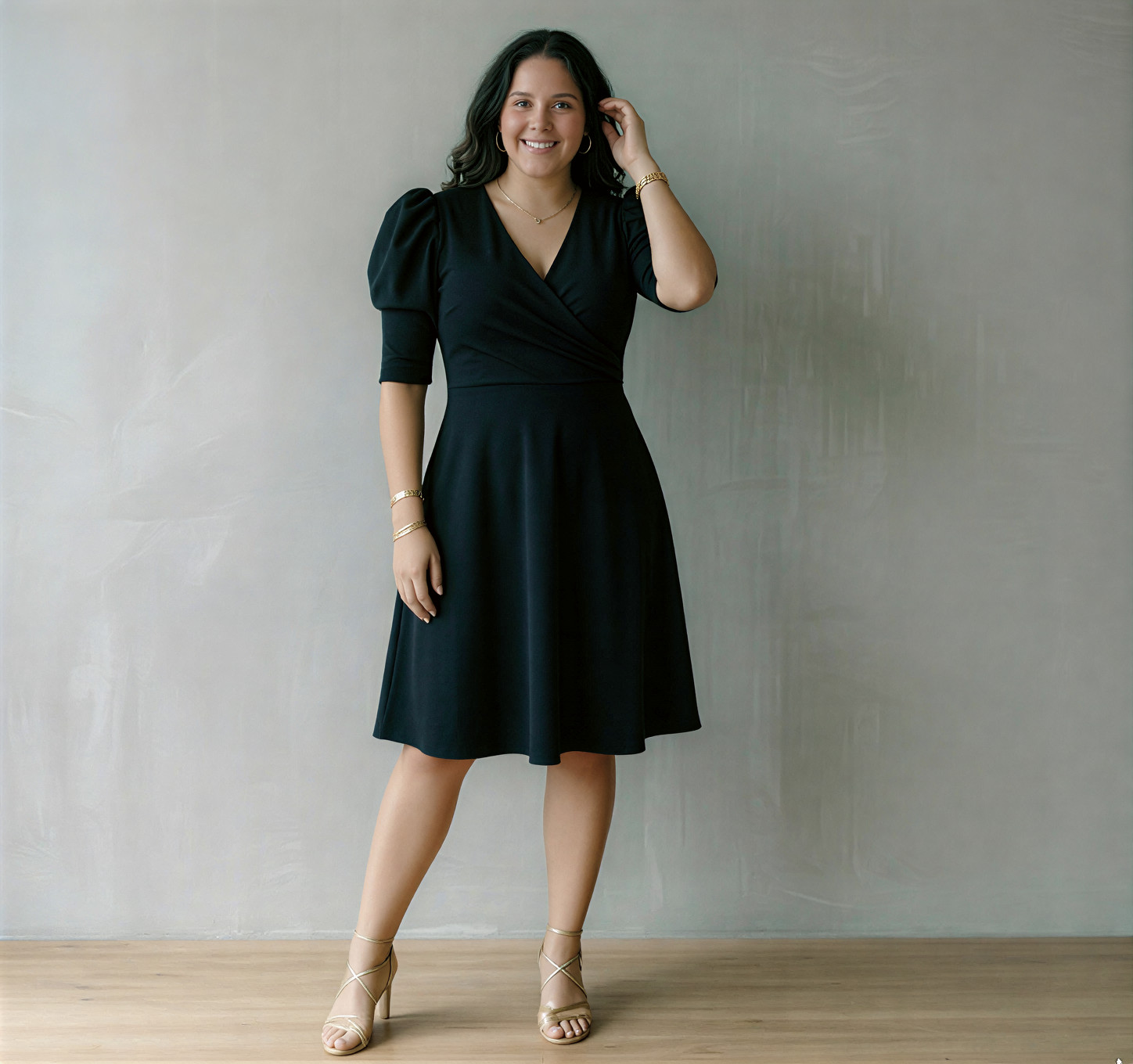 La tela es SCUBA CREPE (ligeramente gruesa, elasticidad del 40%, con una superficie ligeramente rugosa tipo crepé. No es brillante, lo que le da un aspecto más sofisticado y mate). Este elegante vestido destaca por su diseño cruzado en el escote que realza el busto de forma natural y una falda en corte A que estiliza la silueta, brindando un equilibrio perfecto entre comodidad y soporte 👗. Sus mangas cortas con volumen tipo puff añaden un toque moderno y femenino que enmarca los hombros con delicadeza ✨. Gracias a la estructura de su tejido, la prenda moldea el cuerpo sin marcar imperfecciones, ofreciendo una caída impecable y un ajuste seguro mediante su cremallera posterior o lateral. Es la pieza ideal para lucir sofisticada, sintiendo la suavidad de una textura con cuerpo que recupera su forma original tras cada uso ⭐.