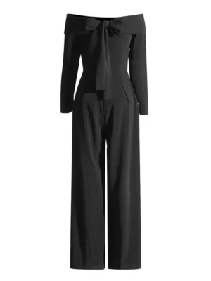 ¡Romántico y sofisticado! Este jumpsuit off-shoulder con mangas largas y pierna amplia es ideal para destacar con elegancia en cualquier evento. Su escote bardot enmarca los hombros de forma delicada, mientras los pliegues delanteros añaden estructura y movimiento. Confeccionado en scuba crepe, una tela ligeramente gruesa con 40% de elasticidad que se ajusta cómodamente sin marcar, su textura tipo crepé y acabado mate le dan un look moderno y refinado