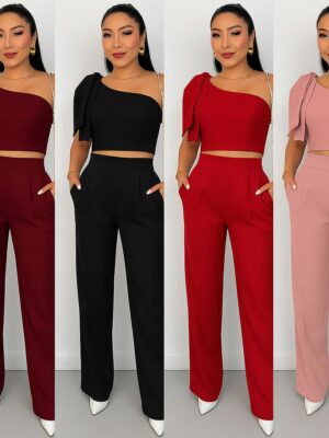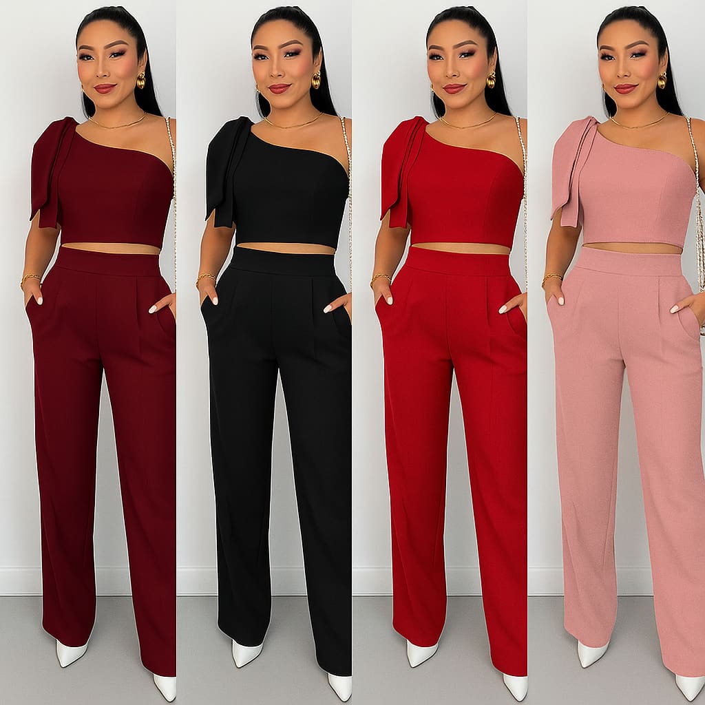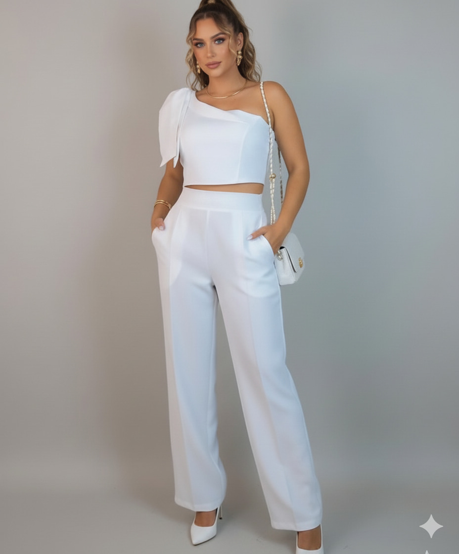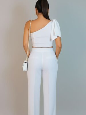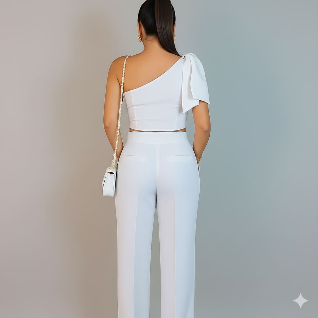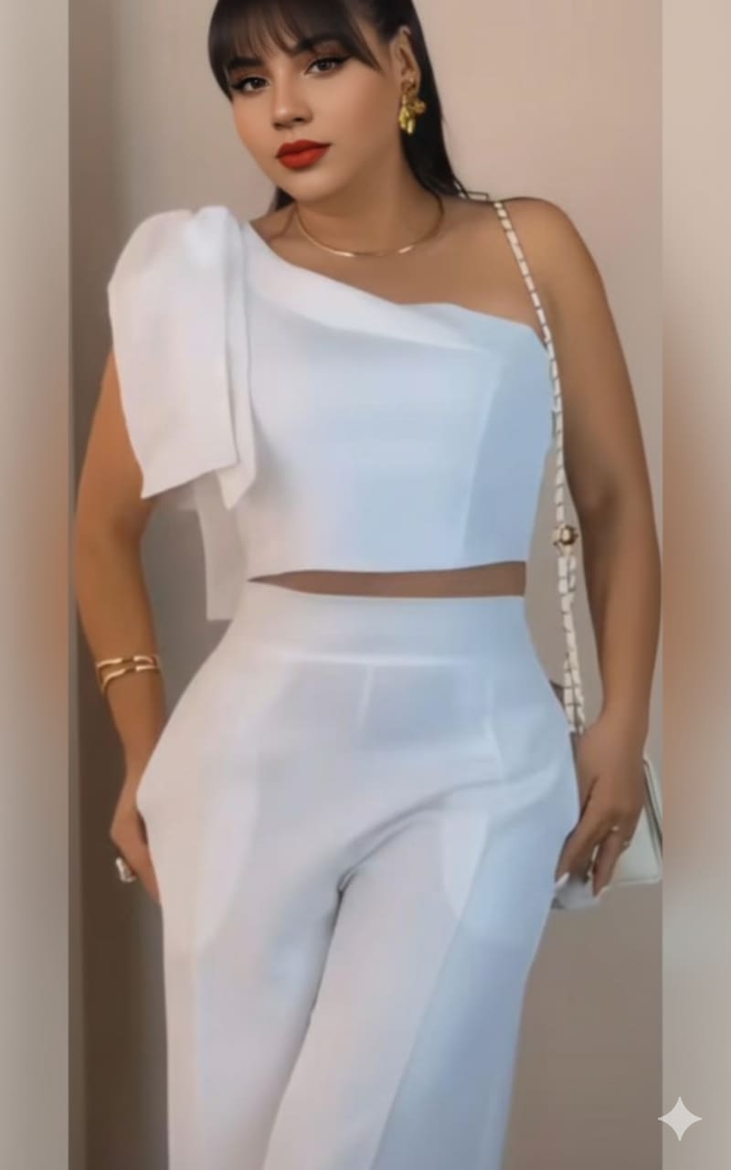 Conjunto de dos piezas con cremallera invisible en el pantalon, esta prenda está confeccionada en Scuba Crepe stretch, hombro de anudar un tejido moderno de acabado mate con un 40% de elasticidad. Es ligeramente grueso, perfecto para diseños con estructura que no sacrifican comodidad. Además, resiste arrugas y aporta un toque elegante. Descubre su textura de cerca en la sección «Texturas» de nuestra web, donde encontrarás una foto detallada de este material (única foto disponible) en blanco tiene un 18% de transparencia