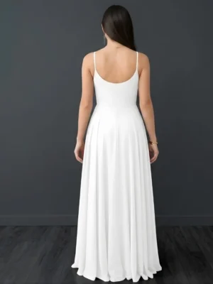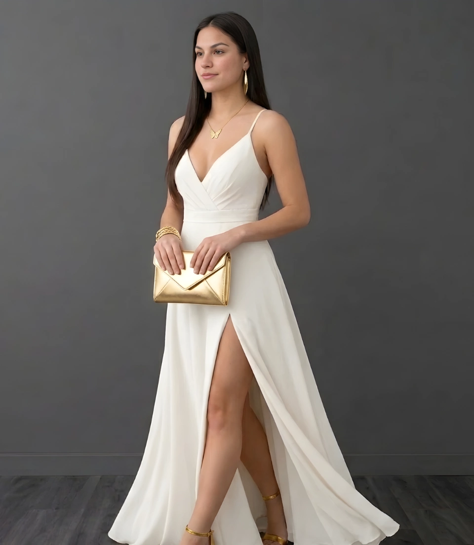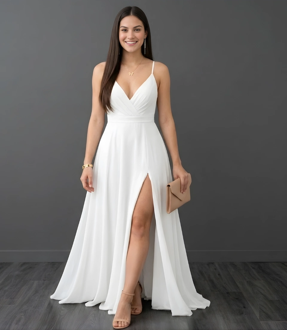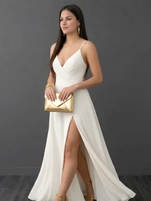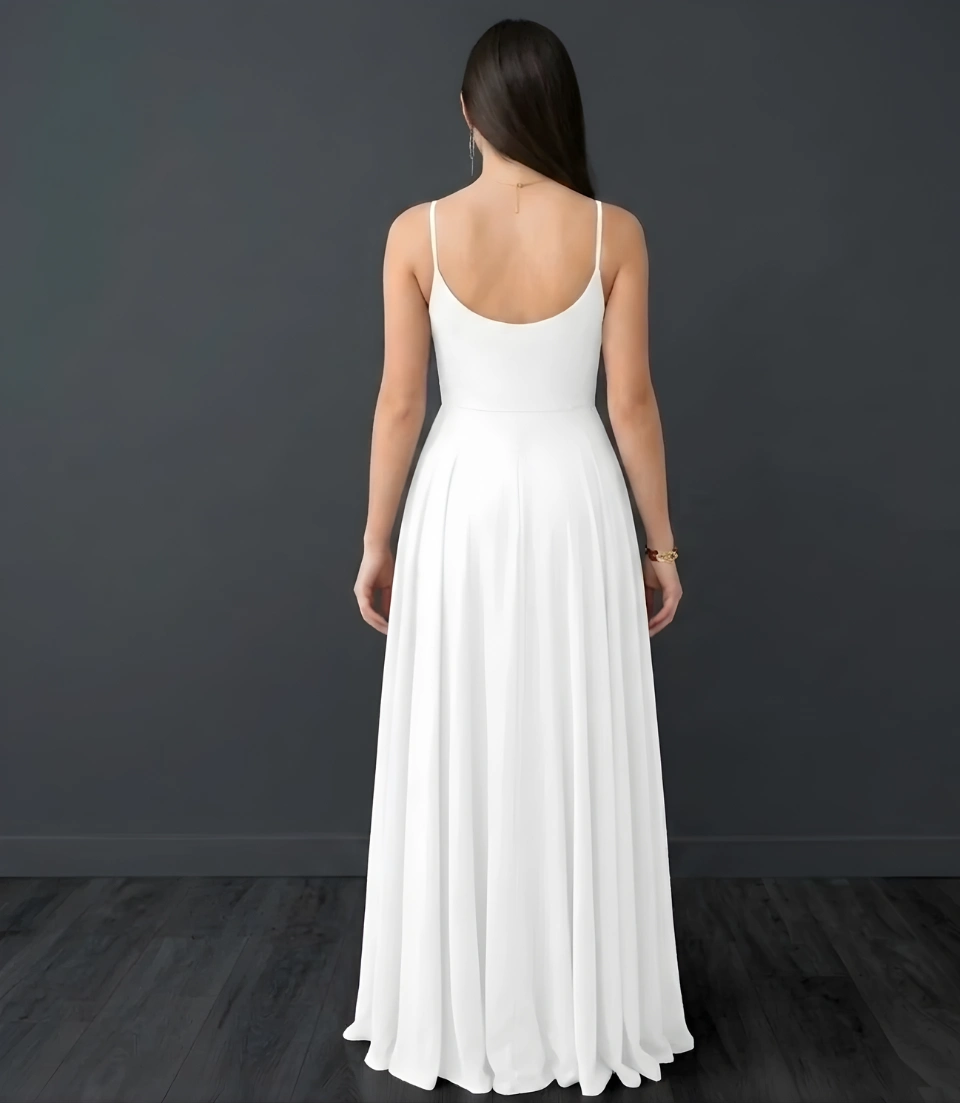 Este vestido largo es ideal para eventos especiales, destacando por su elegante escote en V y delicados tirantes finos que aportan un toque de frescura y sofisticación. La falda fluida con abertura lateral ofrece libertad de movimiento, mientras que la cintura ceñida resalta la figura con un estilo minimalista y chic. 🌹(No tiene copas, varillas, can can, ni forro) puedes agregar un fondo💃