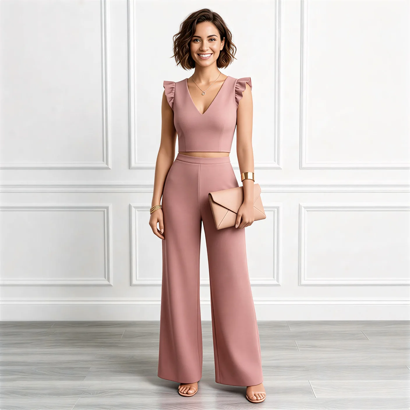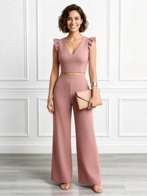 🌷Este conjunto dos piezas combina delicadeza y estilo moderno en un diseño que resalta la figura con sutileza. El top con escote en V y volantes en los hombros añade un toque romántico, mientras que el pantalón palazzo de tiro alto estiliza y alarga visualmente las piernas ✨. Confeccionado en Scuba Crepé, una tela ligeramente gruesa con un 40% de elasticidad, firme pero cómoda, con textura sutil tipo crepé y acabado mate que transmite elegancia sin brillos 💫. Incluye cremallera oculta para un ajuste discreto y pulido. Ideal para destacar con confianza en cualquier ocasión 💃