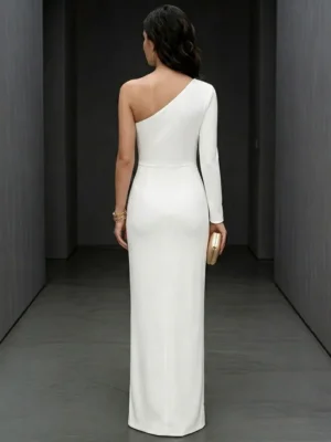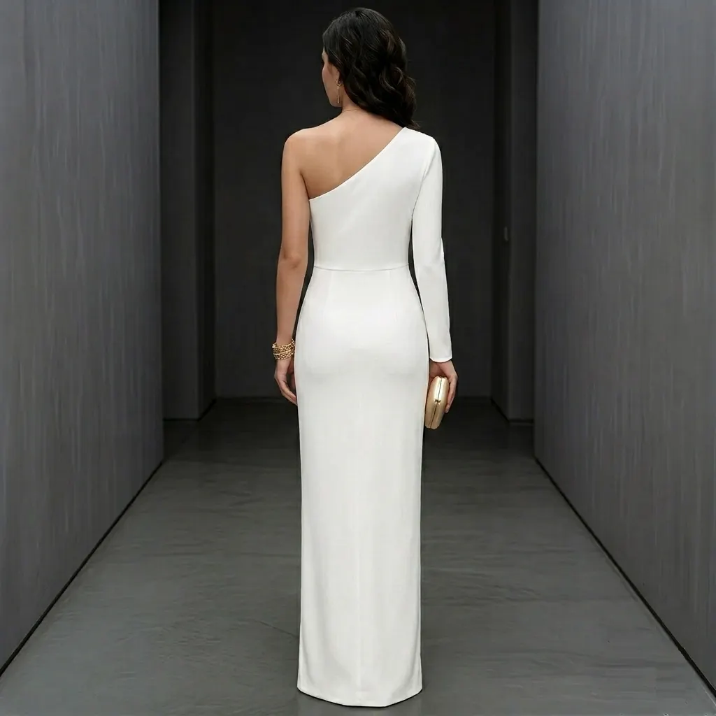 Este vestido largo de corte asimétrico con una sola manga es perfecto para ocasiones especiales, combinando sensualidad y elegancia. Su escote en V y la abertura lateral en la pierna añaden un toque atrevido, mientras que el ajuste ceñido resalta la figura de manera sofisticada. Confeccionado en Scuba crepe, una tela ligeramente gruesa y elástica al 40%, con una superficie rugosa tipo crepé que no es brillante, ofreciendo un acabado mate y sofisticado. Esta tela se ajusta cómodamente al cuerpo sin perder forma, proporcionando una caída fluida y permitiendo libertad de movimiento, ideal para eventos donde quieres destacar con estilo. Tiene un 20% de Transparencia unicamente, grosor 220gr. puedes usar fondo si lo deseas, No tiene varillas, forro, copas ni corset.👗✨