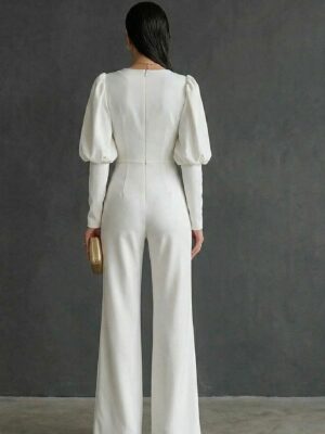 ✨ Este elegante jumpsuit blanco es la fusión perfecta entre estilo y comodidad. Con su diseño de manga larga y con volumen, elegante y chic, pantalón semirecto, estiliza la silueta y alarga visualmente las piernas. La tela Scuba crepé ofrece una sensación única: ligeramente gruesa, con elasticidad del 40%, textura suave tipo crepé y acabado mate, ideal para un look sofisticado sin transparencias ni brillos molestos. Cuenta con cremallera posterior o lateral, incluye cinturon en tela separado del atuendo